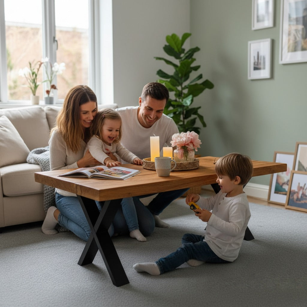 Industrial Scaffold Board Coffee Table on Steel X-Legs Handcrafted Wooden Furniture